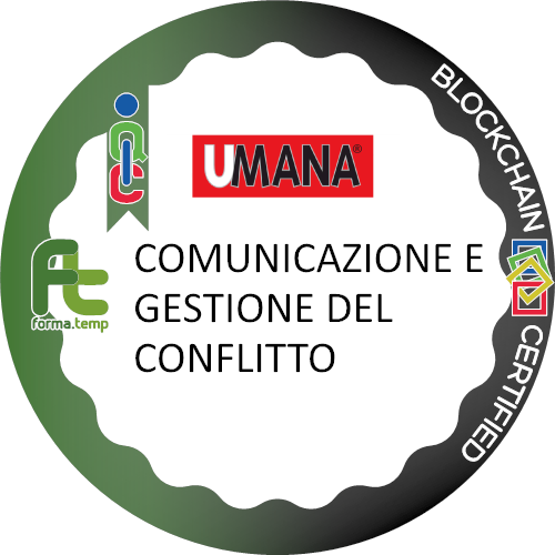 Il proprietario di questo Badge ha partecipato ad un percorso formativo, promosso da Umana Spa e realizzato da Umana Forma Srl in collaborazione con ForIt società cooperativa a R.L. attraverso il finanziamento del Fondo Forma.Temp, finalizzato a fornire ai discenti strumenti utili per comunicare in modo efficace e gestire le situazioni conflittuali.