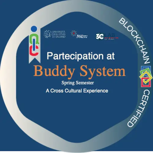 Il Digital Badge "Buddy System Unisa" è un riconoscimento unico ed esclusivo, progettato per celebrare e attestare la partecipazione attiva al programma Buddy System dell'Università degli Studi di Salerno. Questo programma innovativo si dedica a migliorare l'esperienza degli studenti internazionali, facilitando la loro integrazione nella nuova città e università attraverso la guida di studenti locali, detti buddies. Questi ultimi sono accuratamente selezionati per assistere gli studenti internazionali, fornendo supporto in situazioni quotidiane e contribuendo a superare eventuali sfide culturali e sociali.