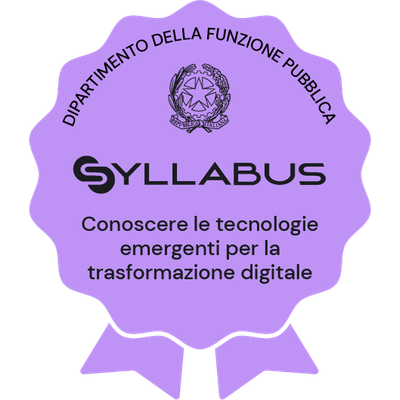 I dipendenti pubblici che hanno acquisito l‘Open Badge “Conoscere le tecnologie emergenti per la trasformazione digitale” hanno completato il percorso formativo, erogato attraverso la piattaforma Syllabus, che mira a rafforzare la conoscenza delle principali tecnologie emergenti e come queste possono o potranno essere utilizzate per la trasformazione digitale della pubblica amministrazione. Il percorso “Conoscere le tecnologie emergenti per la trasformazione digitale” è parte del programma formativo “Competenze digitali per la PA” , che mira a rafforzare le competenze digitali comuni a tutti i dipendenti pubblici al fine di accrescere la propensione complessiva al cambiamento e all’innovazione nella pubblica amministrazione. Il programma è messo a disposizione gratuitamente dal Dipartimento della funzione pubblica della Presidenza del Consiglio dei ministri. Il programma si basa sul S yllabus “Competenze digitali per la PA” che si compone di 11 competenze organizzate in 5 aree tematiche; ciascuna competenza, a sua volta, si articola in un numero variabile di conoscenze/abilità raggruppate secondo tre livelli di padronanza (base, intermedio e avanzato). “Conoscere le tecnologie emergenti per la trasformazione digitale” è una delle 11 competenze previste nel programma “Competenze digitali per la PA” . Il dipendente pubblico che ha conseguito il Badge ha partecipato al percorso formativo personalizzato in funzione della rilevazione dell’effettivo fabbisogno di competenze individuale ed ha superato con successo il test di verifica delle competenze acquisite, relativo al livello di padronanza più elevato (avanzato).