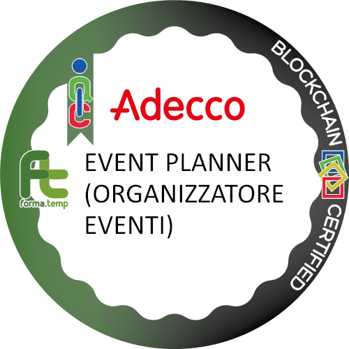 Ottiene questo badge chi partecipa al corso di EVENT PLANNER (ORGANIZZATORE EVENTI). Chi ottiene questo badge dimostra interesse nella figura dell'organizzatore di eventi.