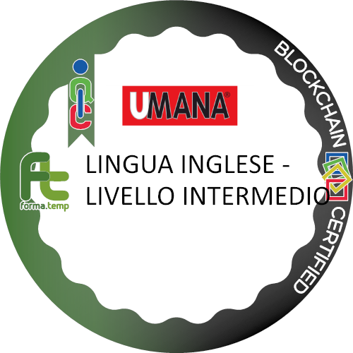 Il proprietario di questo Badge ha partecipato ad un percorso formativo, promosso da Umana Spa e realizzato da Umana Forma Srl in collaborazione con ForIt società cooperativa a R.L. attraverso il finanziamento del Fondo Forma.Temp, finalizzato a fornire ai discenti strumenti utili per la comprensione della lingua inglese livello intermedio.