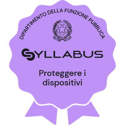 I dipendenti pubblici che hanno acquisito l‘Open Badge “Proteggere i dispositivi” hanno completato il percorso formativo, erogato attraverso la piattaforma Syllabus, che mira a rafforzare: la conoscenza degli attacchi informatici e dei rischi ad essi associati e la prevenzione degli stessi attraverso l’adozione di appropriate precauzioni a partire dalle più semplici, come una corretta impostazione della password; la capacità di saper riconoscere, valutare e affrontare un attacco informatico al proprio dispositivo personale. Il percorso “Proteggere i dispositivi” è parte del programma formativo “Competenze digitali per la PA” , che mira a rafforzare le competenze digitali comuni a tutti i dipendenti pubblici al fine di accrescere la propensione complessiva al cambiamento e all’innovazione nella pubblica amministrazione. Il programma è messo a disposizione gratuitamente dal Dipartimento della funzione pubblica della Presidenza del Consiglio dei ministri. Il programma si basa sul Syllabus “Competenze digitali per la PA” che si compone di 11 competenze organizzate in 5 aree tematiche; ciascuna competenza, a sua volta, si articola in un numero variabile di conoscenze/abilità raggruppate secondo tre livelli di padronanza (base, intermedio e avanzato). “Proteggere i dispositivi” è una delle 11 competenze previste nel programma “Competenze digitali per la PA” . Il dipendente pubblico che ha conseguito il Badge ha partecipato al percorso formativo personalizzato in funzione della rilevazione dell’effettivo fabbisogno di competenze individuale ed ha superato con successo il test di verifica delle competenze acquisite, relativo al livello di padronanza più elevato (avanzato).